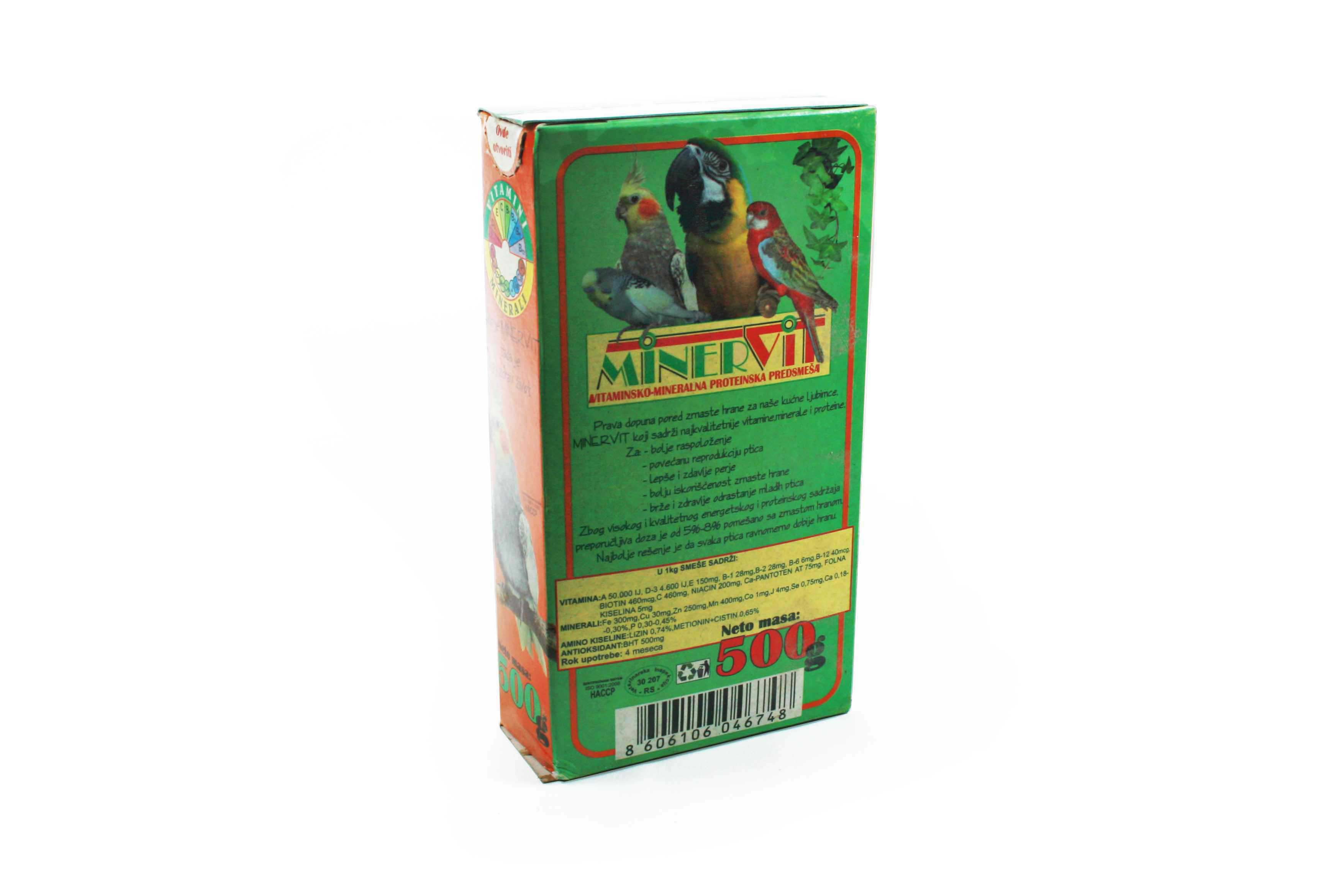 A MINERVIT egy fehérje-vitamin-ásványi előkeverék egzotikus madaraknak, hullámos papagájoknak és nimfáknak.